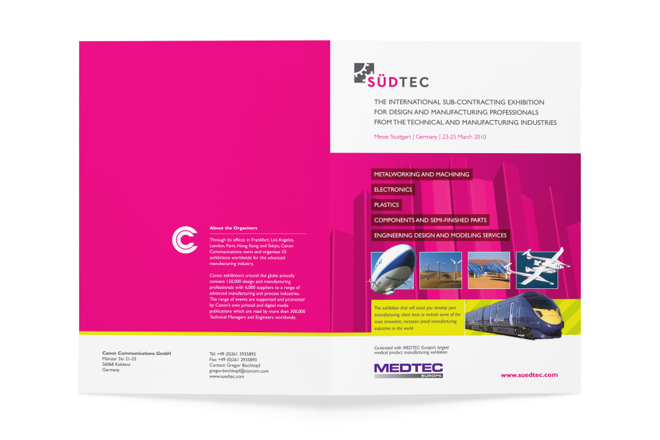 Südtec is the international sub-contracting exhibition for design and production professionals in the technical and manufacturing industries of southern Germany. I was approached by the exhibition’s organisers, Canon Communications, to design and produce various printed items including prospectuses, promotional brochures and invitations. All items were produced in both English and German language versions.